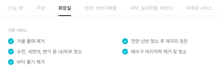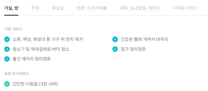예를들면 거실이나 방의 경우에는 가구의 먼지 제거와, 바닥 청소, 물건 정도와 건조된 빨래 정리 등은 포함되지만 다림질을 받고 싶다면 유료로 추가해야 합니다.
