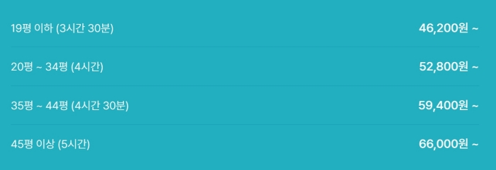 기준 가격은 19평 이하를 3시간 30분으로 보고 46, 200원부터 라고 기입해 두었으며, 5시간 이상 걸리는 45평 이상의 집은 66,000원 부터라고 합니다.