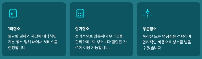 물론 집(혹은 방) 전체 청소가 필요하지 않은 경우에는 부분 청소도 가능합니다. 예를 들면 화장실이나 냉장고처럼 혼자서 하기 힘든 구역도 이용받을 수 있습니다.