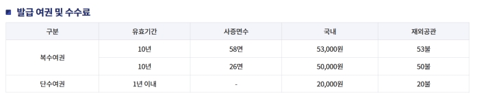 비용은 기간과 사증면수에 따라 달라집니다. 종류는 복수여권과 단수여권으로 나뉘고 유효기간은 10년, 1년으로 구분됩니다. 또한 유효기간이 10년인 경우도 사증 면수가 58면이냐 26면이냐고 가격차이가 나는데 3천 원밖에 나지 않기 때문에 한번 만들 때 10년짜리로 만들어 두는 것이 좋을 듯합니다.