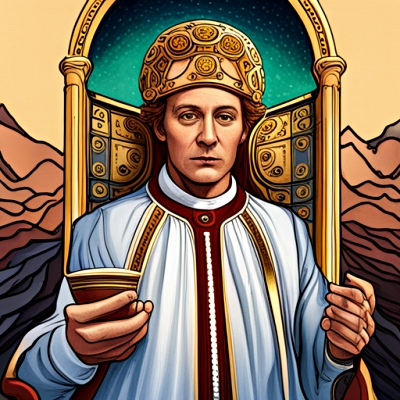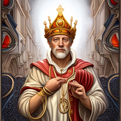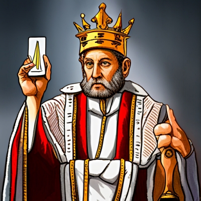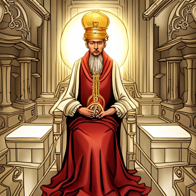 그림을 보면 가운데 왕관을 앉은 사람이 왕좌에 앉아 있습니다. 그는 교황입니다. 그의 앞으로는 2명의 제자가 보이고, 2명의 제자는 교황에게 복종하며 동시에 지혜를 교육받아 감사의 마음을 전하고 있습니다.