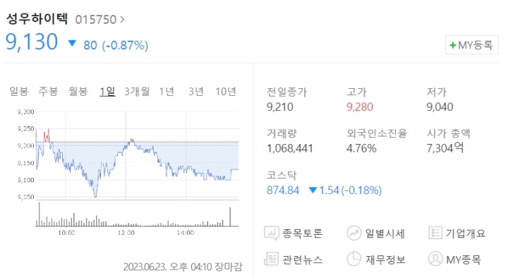 두 번째는 코스닥에 등록되어 있는 중형주인 성우하이텍입니다. 현재 기준으로 (2023년 6월 24일 오전 9시 07분) 주가가 9,130원입니다. 지난 기록을 보면 2013년도에 가장 높은 주가를 보였고, 기록상 최고는 17385 원까지 올라갔었다고 합니다.